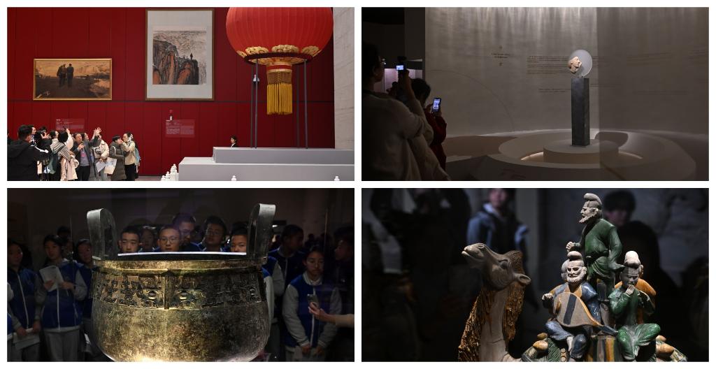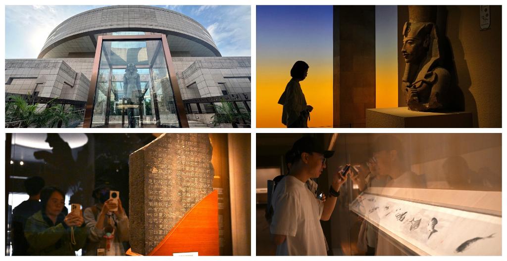 拼图:(左上、左上)上海博物馆人平易近广场馆的“之巅:古埃及文明大展”;(左下)上海博物馆东馆的中国历代书法馆(左下)上海博物馆东馆的中国历代绘画馆