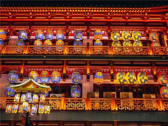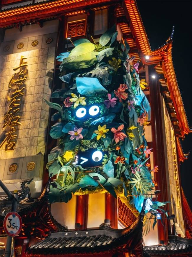 豫园商场外圈,上海老饭馆外墙“黑科技”满满,森林之眼灯组中藏着很多小动物的眼睛,猎奇地凝视着逛人,小动物们的目光,也激发逛人的猎奇心,引领他们走进灯海森林探险。旧校场则被两组可爱又不失保守文化元素气概的灯笼打扮一新,一组以春秋中晚期青铜器上的蛇纹样为根本,一组以京剧脸谱为灵感,保守工艺取现代演绎相得益彰。