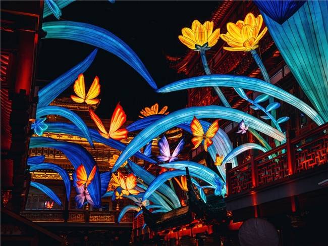 豫园老街展示豫园灯会30年的灯彩过程,从中国十大灯彩门户中,选其典范制型精细还原,营制出“花市灯如昼”的沉浸感。让大师感触感染保守灯彩正在现代化立异中的改变,通过各个门户的灯笼展现,聚焦非遗文化,传达中国灯彩艺术的和合之美。