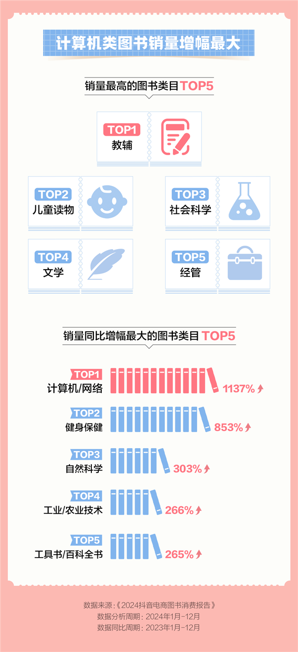 从分歧地域消费上看,省图书订单量增幅最大为113%,广西、、河南、辽宁紧随其后,成为图书订单量同比增幅最大的前五大省份。演讲显示,过去一年,118个城市的图书订单量翻倍,此中,新星市、绥化市、可克达拉市、梧州市增幅十分可不雅,上榜图书订单量同比增幅最大前五城市。数据显示,无论是抢手的儿童读物、文学、经管类图书,仍是小众的工业农技类、东西书,过去一年正在抖音电商都遭到读者青睐。教辅、儿童读物、社会科学、文学、经管类成为该平台销量最高的五大图书类目;计较机/收集位列销量增幅榜首位,同比增加1137%;健身保健、天然科学、工业/农业手艺和东西书/百科全书等专业范畴图书也颇受欢送。