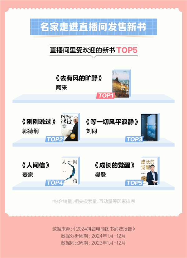 1月10日,《2024抖音电商图书消费演讲》(下文简称 “演讲”)发布,从图书销量、用户买书偏好、出书社成长等维度,呈现了抖音电商过去一年的图书消费概况。演讲显示,抖音电商全年图书销量超7。3亿单,采办图书的用户数量同比增加超 130%,跨越50家出书社的曲播成交额同比翻倍。此中,《去有风的田野》《信》等曲直播间最受欢送的新书。通过曲播、短视频等内容渠道和商城、搜刮等货架渠道,帮力优良图书取读者毗连,为全平易近阅读不竭注入活力。2023年,抖音电商图书营业继续连结不变成长,正在全体发卖规模、用户、内容等方面均有所提拔。演讲显示,平台全年图书销量超7。3亿单,平均每天售出图书约300万册。正在当下出书刊行市场,曲播取短视频成为带动图书发卖的环节渠道。抖音电商数据显示,2024年,该平台上图书相关曲播累计旁不雅跨越313亿次,通过曲播形式促成的图书成交额正在全体图书成交额中占比达到45%。图书做为学问产物,曲播和短视频的体例可以或许帮帮其内容被读者更快速和全面地领会,推进读者对心仪册本的选购。越来越多出书社、图书商家加大了正在曲播和短视频渠道方面的投入力度,实现本身营业转型、拓展了新增加点。一方面,出书社不竭提拔正在曲播和短视频渠道的内容和手艺能力。演讲显示,抖音电商图书动销商家数量同比增加48%;超50家出书社曲播成交额同比翻倍,此中,故宫出书旗舰店、外研社旗舰店、人平易近文学出书社图书旗舰店、上海出书社旗舰店、做家出书社旗舰店等5家出书社店肆曲播成交额增幅最大。另一方面,出书社取做家、图书达人合做曲播,让新书、好书取读者的 “双向奔赴”。过去一年,莫言、余华、阿来、麦家等五十多位做家、名人带着新做走进曲播间。2024年3月,麦家携新书《信》和董宇辉正在抖音取辉同业 曲播间对谈,吸引跨越25万人同时正在线旁不雅。《信》首发便售出6。8万册,取《去有风的田野》《方才说过》《等一切海不扬波》《成长的》一路,成为曲播间年度最受欢送新书。