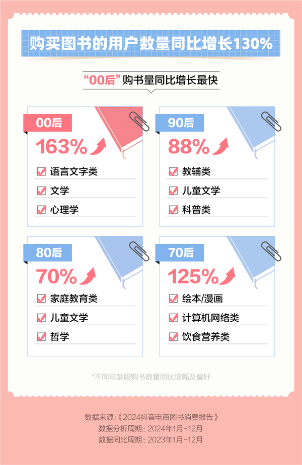 除了通过短视频和曲播获取学问、好书资讯,越来越多读者已养成了通过抖音自动搜刮图书、采办图书的习惯。演讲显示,由抖音商城、搜刮、店肆等货架场景带动的图书销量同比增加105%,《我取地坛》《飞鸟集》《朝花夕拾》《灵犬莱西》《黄雀记》等最受货架场读者青睐。短视频、曲播以及货架场景,以其愈加丰硕全面的内容展现、能够更好地满脚分歧条理读者的购书需求。演讲显示,2024年,通过抖音电商采办图书的用户数量同比增加超 130%,“00后”买书热情高涨。数据显示,“00后”购书数量同比增加最快达163%,偏心言语文字、文学、心理学类图书;“80后”“90后”购书数量别离增加70%和88%,喜好买教辅、家庭教育、儿童文学等图书;“70后”则更关心饮食养分类册本,购书数量同比增加125%。
