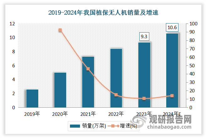 虽然近年我国聪慧农业获得了快速成长,研究及开辟已初具规模,尺度化手艺和使用过程也相对较为成熟。但对比全球市场,我国聪慧农业起步较晚,农业机械化、功课智能化程度远低于其他领先国度(如如高端农业传感、生命消息设备被美国、日本、等企业垄断,大马力高端智能配备较多依赖于进口,动动物发展模子取焦点数据次要来自美国、以色列、荷兰、日本等),市场照旧处于以示范项目指导的成长初期,市场空间广漠。从持久的角度来看,聪慧农业是处理我国生齿取地盘矛盾的主要径。按照国度计谋规划,到2025年我国农业数字经济占农业添加值比例要从2021年的7。3%达到 15%。农业出产运营数字化转型取得较着进展。数字手艺取农业财产系统、出产系统、运营系统融合,大田规模化种植、设备园艺尺度园、规模化生猪 / 蛋鸡 / 肉鸡 / 奶牛养殖场、水产健康养殖示范场率先实现数字化转型。到2035 年农业农村现代化根基实现,聪慧农业取得标记性进展,我国进入世界农业强国前列。聪慧农业的“新基建”、新理论、新手艺、新配备、新产物、新业态取得冲破,自从立异能力和程度全面提拔,聪慧农业学科取立异团队达到国际一流程度。农业次要环节的数字化全面转向农业全财产链、全环节的数字化和收集化,批量建成少人化或无人化的聪慧农(牧、渔)场,根基建成“软件定义、数据驱动、配备支持、财产融合”的聪慧农业财产系统。农业传感器取测控终端、农业智能配备制制、农业软件等财产规模不竭强大,聪慧农业财产焦点合作力达到国际先辈程度。具体而言,估计大田、设备、畜禽、水产出产数字化程度别离达到 50%、70%、75%、75%,农业数字经济占第一财产 P 的比沉跨越 70%。植保无人机,是用于农林动物功课的无人驾驶飞机,该型无人飞机由飞翔平台(固定翼、曲升机、多轴飞翔器)、飞控、喷洒机构三部门构成,通过地面遥控或飞控,来实现喷洒功课,能够喷洒药剂、种子、粉剂等。近年跟着科技的飞速成长,植保无人机正成为农业范畴的抢手话题。做为现代农业手艺的新兴代表,植保无人机凭仗其经济、环保等劣势,逐步获得了泛博农人伴侣和农业企业的承认。按照数据,2023年我国植保无人机销量达9。3万架,较上年同比增加10。71%。估计2024年我国植保无人机销量达10。6万架,较上年同比增加13。98%。