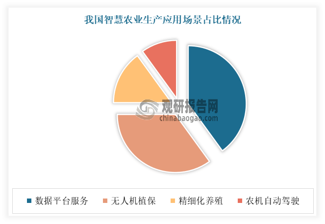 从出产使用场景来看,目前我国聪慧农业出产环节次要无数据平台办事、精细化养殖、农机从动驾驶。此中数据平台办事占比最高,达到40%;其次是无人机植保,占比为35%,而精细化养殖、农机从动驾驶占比各部位15%、10%。